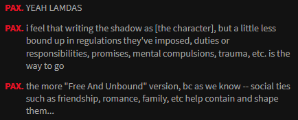 Set's shadow is highly representative of his former self, as the tyrannical king of Egypt. It speaks in riddles, references his current "weaknesses" and "vulnerabilities", and generally is utterly unhinged. [ x, x ]